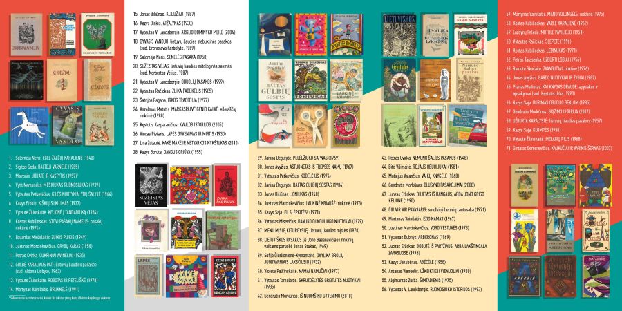 Seniausia sąrašo knyga – Motiejaus Valančiaus „Vaikų knygelė“ (1868); prie jos glaudžiasi Žemaitės „Rinkinėlis vaikams“ (1904), Vinco Pietario „Lapės gyvenimas ir mirtis“ (1905). O naujausios šimtuke atsidūrusios knygos – Akvilinos Cicėnaitės „Niujorko respublika“ (2015) ir Rebekos Unos „Atjunk“ (2015).