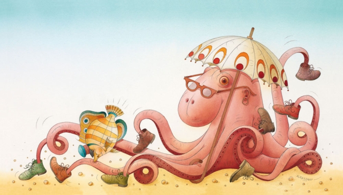 „Povandeninę istoriją“ parašiau maždaug prieš metus. Tuo metu buvo žiema ir labai norėjosi kažko vasariško. Prieš tai mano paskutinioji knygelė „Sapnų Katytė“ (2012 metų knyga vaikams. – Redakcijos pastaba), kaip galima suprasti iš pavadinimo, buvo apie sapnus. Ir tos istorijos veiksmo vieta buvo kažkur labai aukštai debesyse. Taigi, po jos užsimaniau iš debesų nerti stačia galva žemyn į jūrą. Man labai patinka žuvys, esu jų šiek tiek piešęs ir anksčiau. Tačiau ilgesnės istorijos apie žuvis dar nebuvau parašęs. O juk tai tokie šaunūs padarai! Juo labiau, kad ši mano istorija apie aštuonias koralines žuvis, kurios yra ypatingai spalvingos ir gražios. Pavasarį daug keliavau todėl iliustracijas pradėjau piešti tik vasarą. Atrodytų, kad palankiausia vieta piešti šioms iliustracijoms turėtų buti po vandeniu. Tačiau, atlikęs keletą nesėkmingų eksperimentų savo sklidinoje vandens vonioje, nusprendžiau, kad geriau jau piešiu sausumoje. Kaip ir visada. Žinoma, po vandeniu akvareliniai dažai tikrai gražiai liejasi. Tik kad ant popieriaus nieko nelieka. Taigi sėdau prie savo darbo stalo ir už lango linksmai šviečiant saulei, kibau į darbą. Aišku, visiškai be vandens nepavyko išsiversti, nes piešiant vandeniniais (akvareliniais) dažais jis tiesiog būtinas. Todėl ant mano stalo visada stovėjo didelis stiklainis vandens. Popieriui sudrėkinti, dažams skiesti ir teptukams išplauti. Ši knygelė skirta visiems, kurie mėgsta keliauti, plaukioti, taip pat tiems, kuriems patinka mėlyna jūros ir žydro dangaus spalva. Kad žuvelėms būtų ką veikti, daviau joms darbo. Tvarkyti po audrų sujauktą jūrą. O, kad būtų dar sunkiau, jūros dugne apgyvendinau nelabai draugišką aštuonkojį. Taigi tokį padarą, kuris turi aštuonias kojas, lygiai tiek kiek ir žuvų. Aštuonkojo kojas apmoviau aštuoniais batais. Aš šiuo metu turiu lygiai keturias poras batų, taigi visus tuos batus, pasidėjęs ant darbo stalo ir nupaišiau. Ši istorija dar ir apie draugystę ir apie tai, kaip paprasta ir lengva, net ir atrodytų patį nedraugiškiausią padarą pasaulyje, paversti geriausiu savo draugu. Kęstutis Kasparavičius |