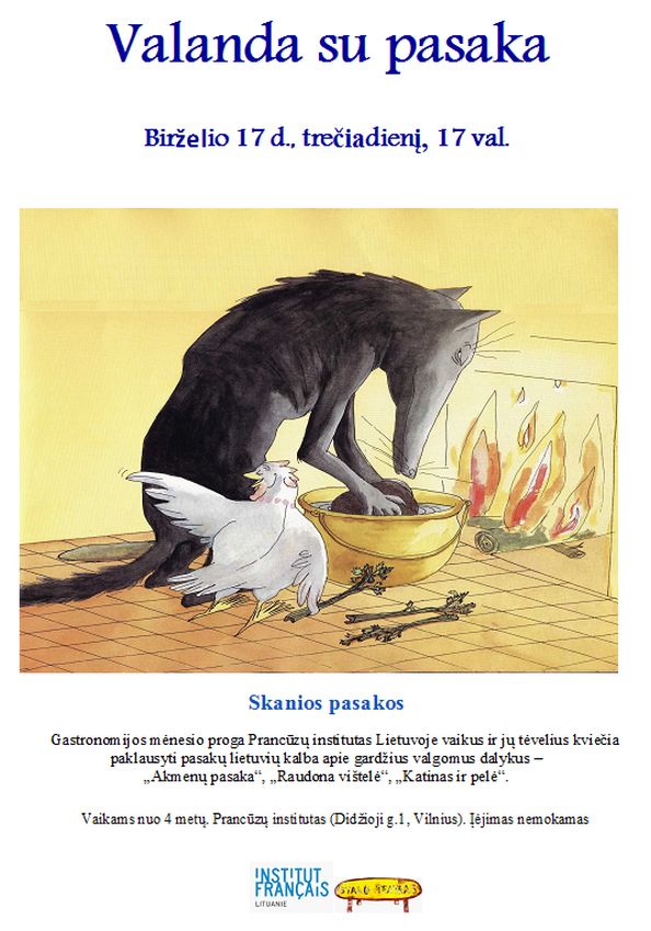 Gastronomijos mėnesio proga Prancūzų institutas Lietuvoje ir „Stalo teatras“ vaikus ir jų tėvelius kviečia paklausyti pasakų lietuvių kalba apie gardžius valgomus dalykus – „Akmenų pasaka“, „Raudona vištelė“ ir „Katinas ir pelė“.