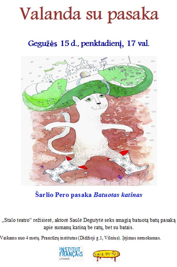 Gegužės 15 d., 17 val. Prancūzų institutas Lietuvoje vėl kvies į „Valandą su pasaka“. Renginio metu „Stalo teatro“ aktorė Saulė Degutytė seks Šarlio Pero pasaką „Batuotas katinas“.